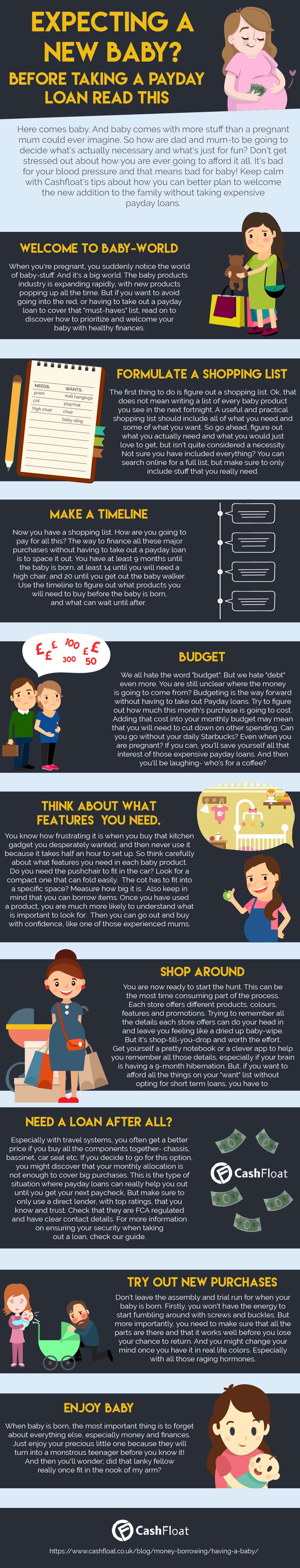 Here’s a fabulous infographic. You can use this to help manage your budget and avoid short term loans when the baby comes.